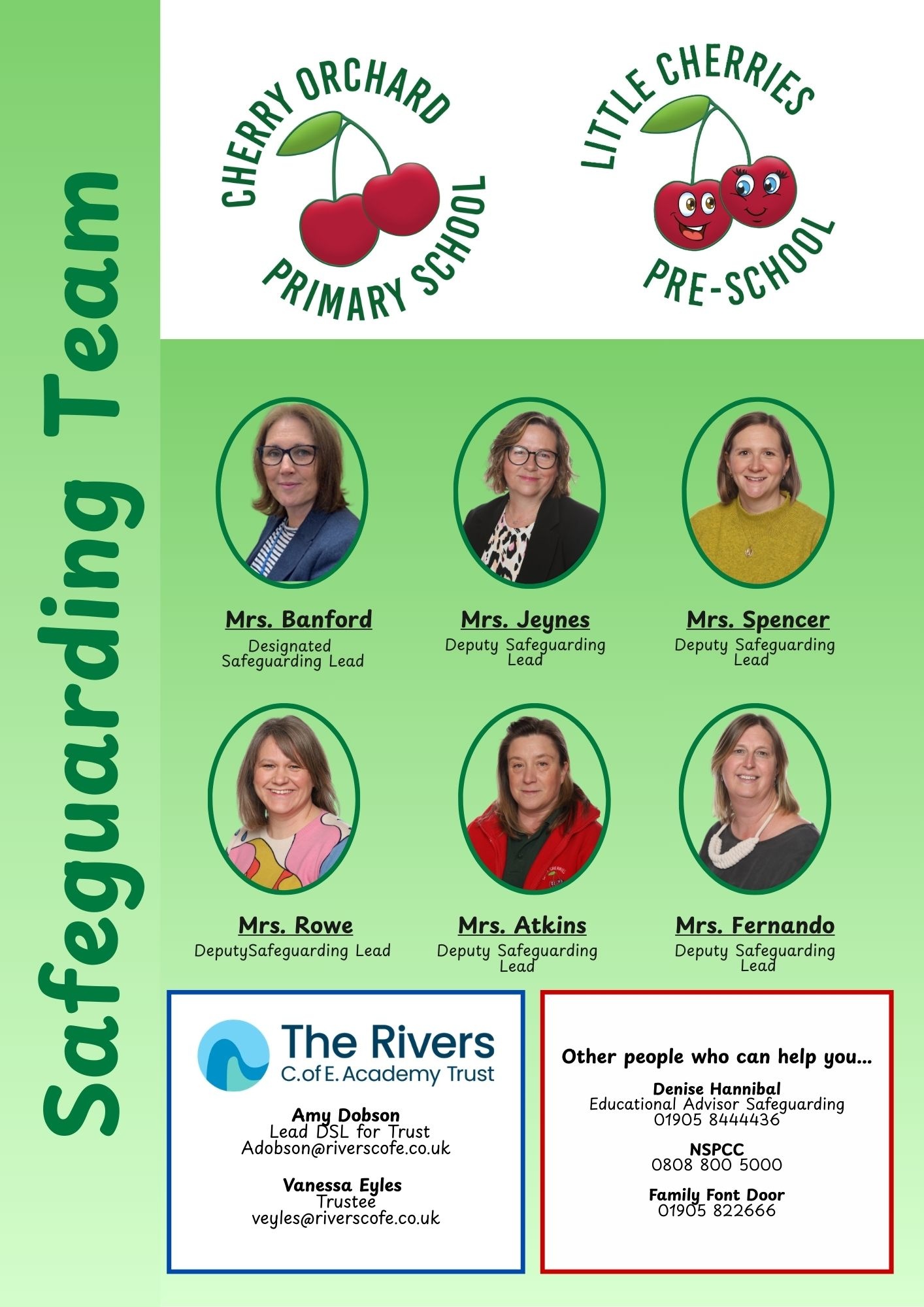 Cherry Orchard Primary School and Little Cherries Pre-school is committed to ensuring the welfare and safety of all our children in school. We believe that pupils have a right to learn in a supportive, caring and safe environment which includes the right to protection from all types of abuse; where staff are vigilant for signs of any pupil in distress and are confident about applying the/our safeguarding processes to avert and alleviate any such problems.
